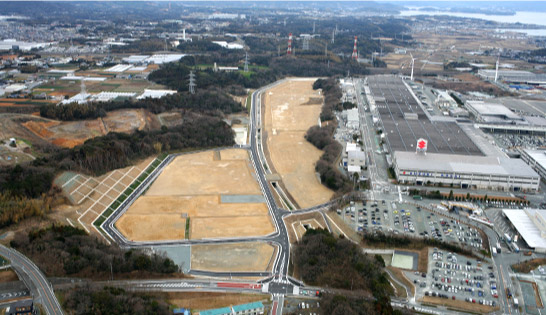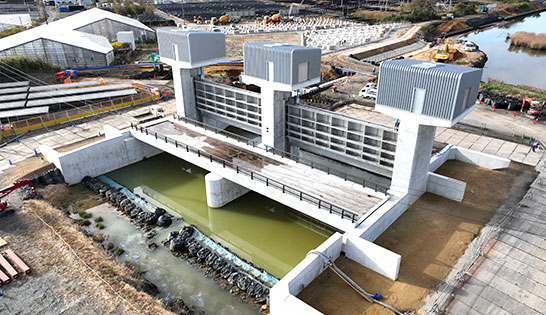 想定される南海トラフ巨大地震による津波被害に備え、この地域の皆様の命と暮らしを守ることを目指し整備された「浜松市沿岸防潮堤」の建設に、地元企業の一社として携わりました。この防潮堤は、適切な強度を実現しながら経済性や環境保全に優れるCSG(Cemented Sand and Gravel)を主材料として、海面からの高さ約13m、延長17.5kmに渡って構築され、一事業として作られたCSG防潮堤としては日本一の規模を誇ります。この整備により、沿岸宅地への浸水面積が8割低減し、特に建物崩壊が危惧される2m以上の浸水面積は98%低減する減災効果が見込まれています。
