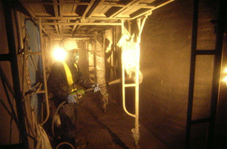橋脚などの長寿命化に最適な乾式吹付工法は、吹付けホース内で水と特殊ポリマーセメントモルタルを混合し、既設構造物に吹付ける工法です。従来の型枠を施しコンクリートを流し込む施工方法に比べ、大幅な工期短縮、コスト削減を実現します。