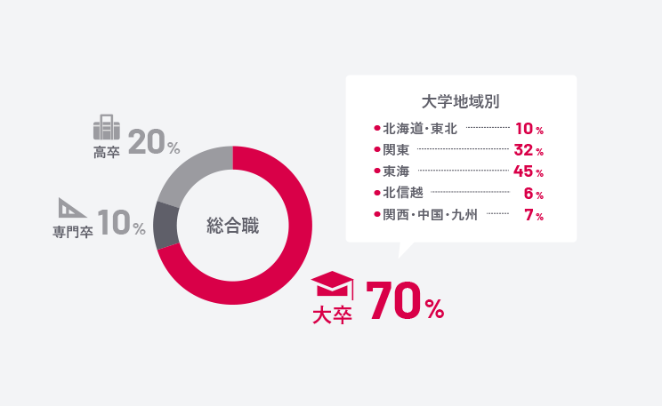 多くが学部卒ですが、高卒や専門学校卒の社員も活躍中。ちなみに地元出身者が多いものの、全国の大学から卒業生が集まっています。