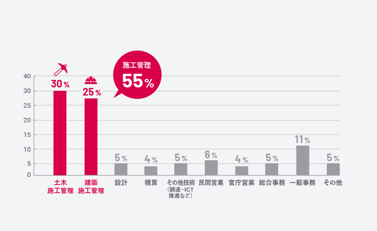 半数以上が施工管理職を務める中村組。現場管理力に定評があります。また、設計や積算、ICT推進など施工管理以外の技術職種も強化しています。