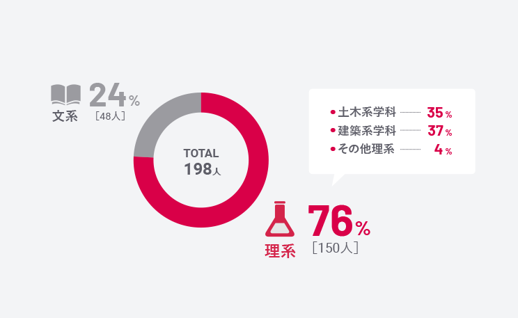 「現場に強い中村組」を裏付けるように、約8割が土木建築系学科の出身者。文系出身者は、主に営業や事務職で活躍しています。