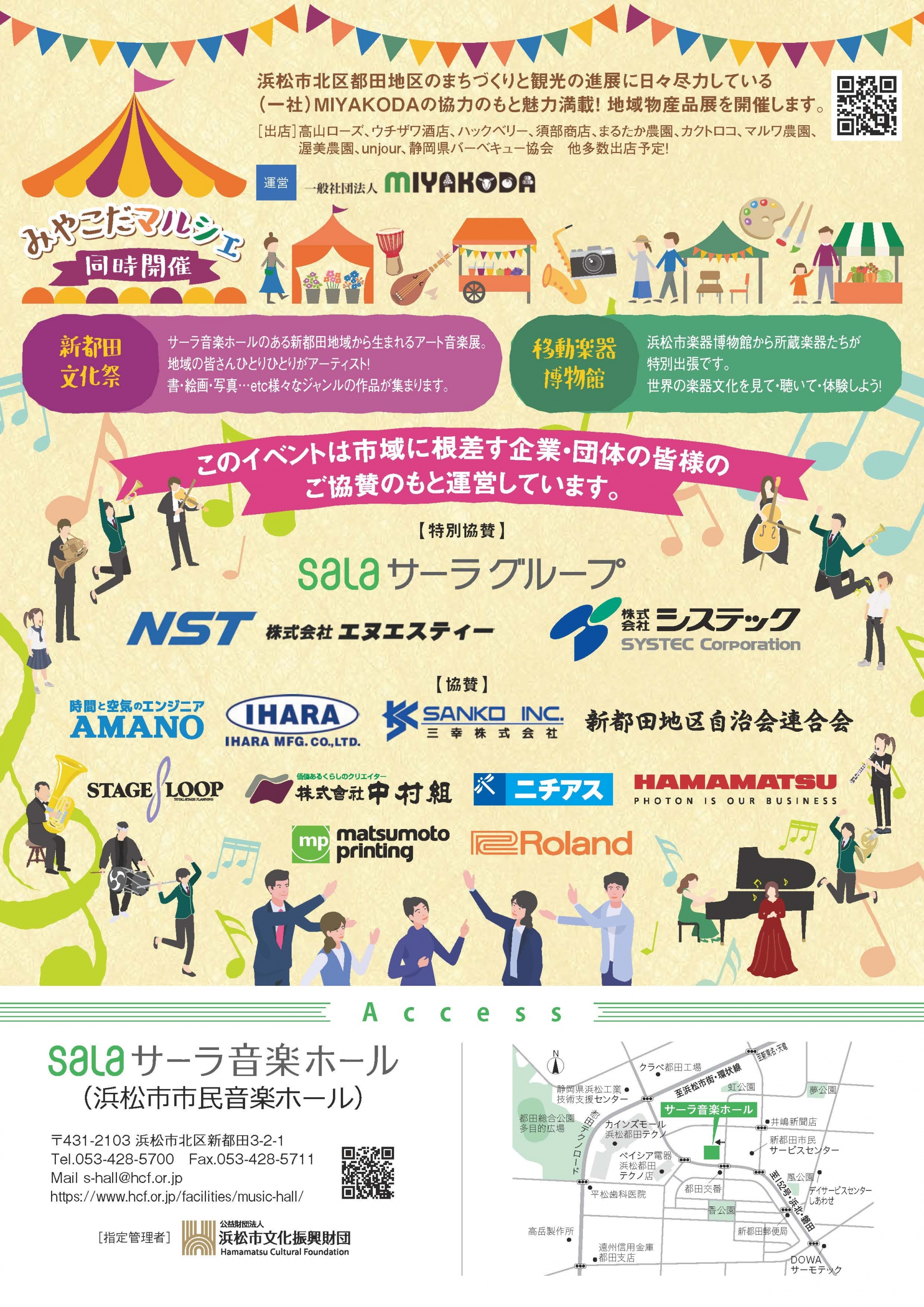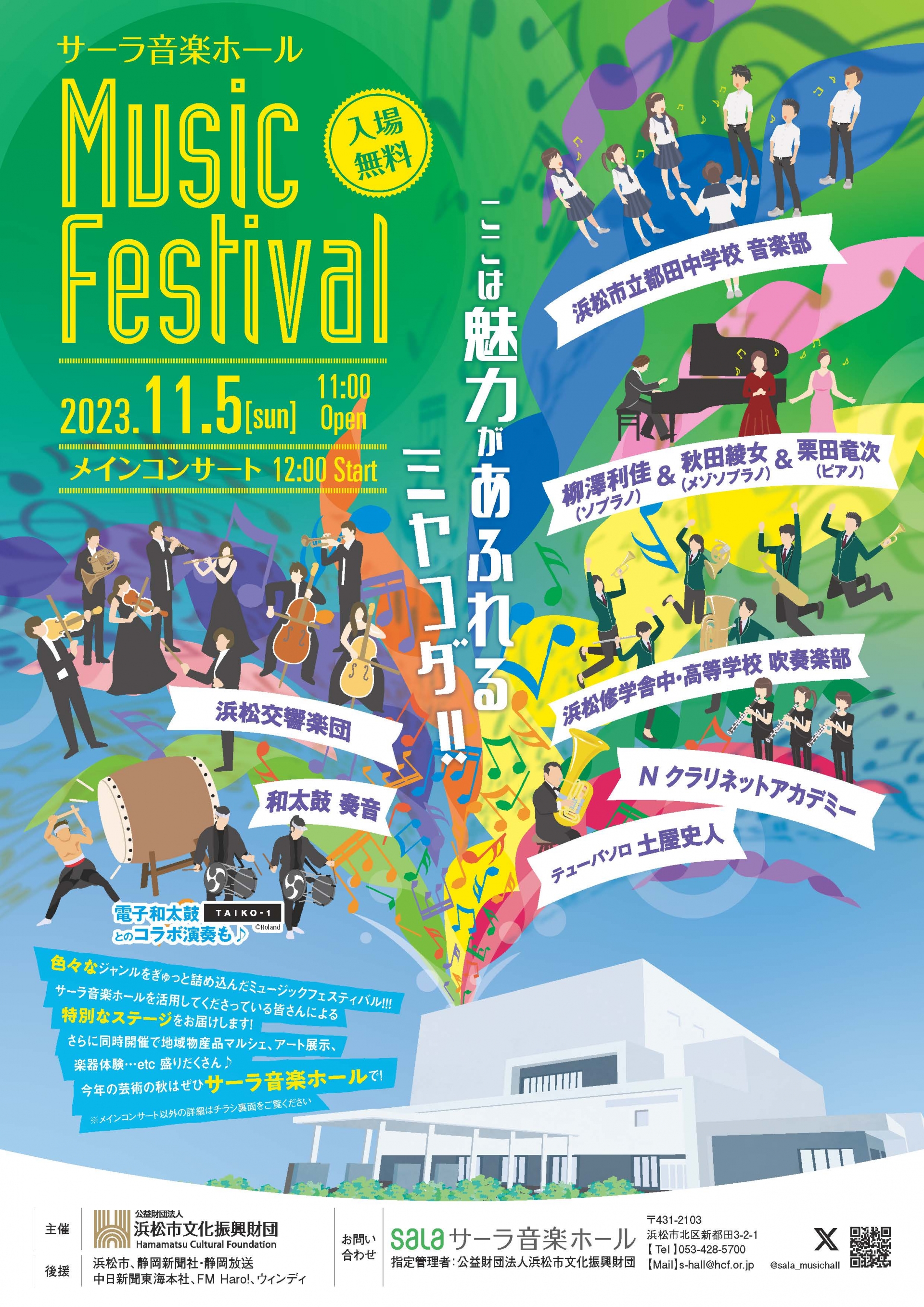 2023年11月5日(土)に開催されるサーラ音楽ホール ミュージックフェスティバル」に協賛しています。 さまざまな音楽コンサートや楽器体験、アート展示、地域の物産展など地域の文化や食を楽しめるイベントが 盛りだくさんのフェスティバルです。