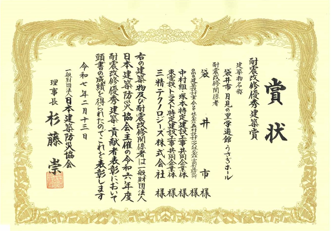 このたび、弊社が施工した「袋井市 月見の里学遊館 うさぎホール」が、一般財団法人日本建築防災協会の「耐震改修優秀建築賞」を受賞しましたので、お知らせします。本賞は、耐震改修を実施した既存建築物の中でも、特に耐震性や防災・安全性、意匠に優れた建築物、およびその関係者を表彰するものです。これからも安全・安心な暮らしの実現に貢献してまいります。