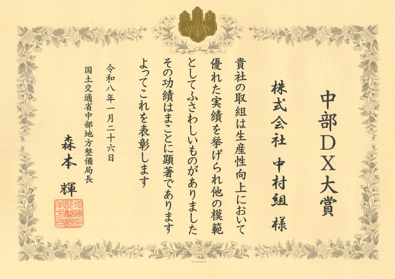 このたび、国土交通省 中部地方整備局長より令和7年度「中部DX大賞」の表彰を受けました。